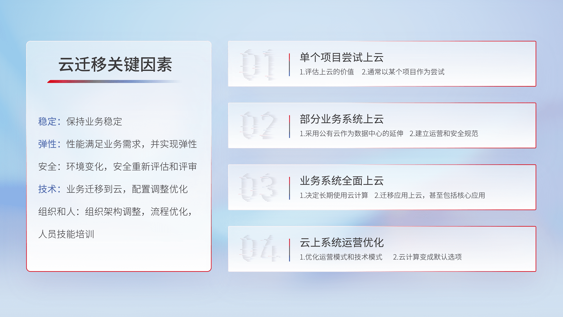 结合实际业务,,,从规划设计、、、云平台选型、、、、云原生改造、、、数据迁移、、、、集成交付,,迁移全过程为客户识别最佳上云路径,,,,做好风险识别管理,,,设计网络架构、、、、身份权限、、、安全审计合规、、、、操作审计、、、日志审计、、、监控告警策略、、多站点容灾设计等,,对云上基础设施进行整体规划,,,,提升IT治理水平,,,以满足弹性、、、、高可用、、、、高性能的需求。。。