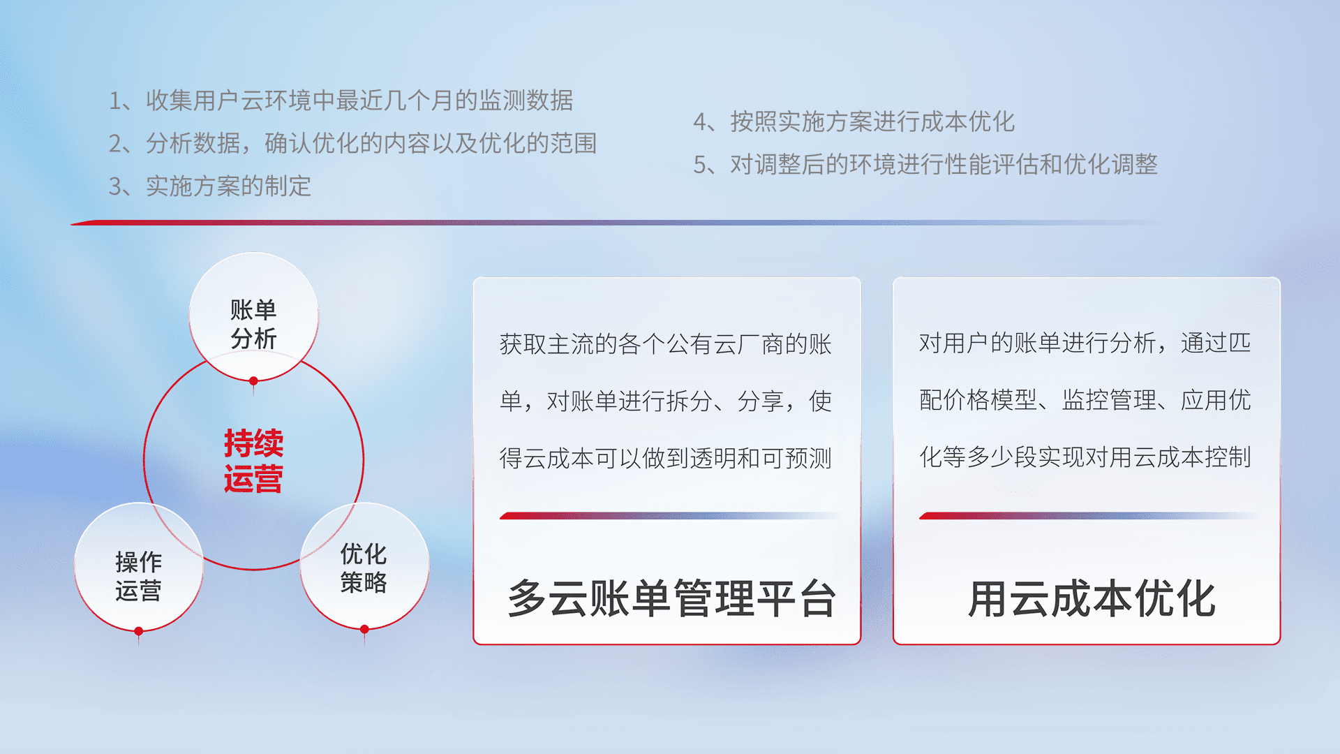 通过多云纳管,,以统一的资源数据模型把客户的云资源进行抽象和封装,,进而实现对多云资源的统一操作,,,保障云资源管理的可靠性、、稳定性与可用性。。。量身定制化运维内容,,,,配置、、、开发运维、、、补丁管理、、、备份、、、监控、、认证和访问管理、、、审计和日常巡检等,,保障在用云过程中的可靠度,,稳定度以及高可用率。。。。